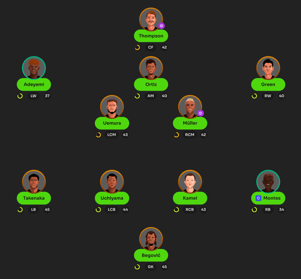 I really hadn’t bought for this formation, so was forced to play our AM out of position as a CM. Weirdly enough, he still managed to be the highest rated CM on the pitch!