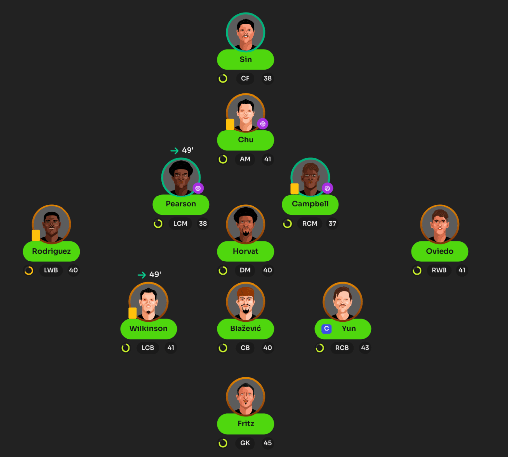 The classic 4-3-3! One of our weak areas, sadly, is our CM’s. Rodney Griffin, despite only being 29 rated, has scored some goals and contributed well, but we knew we had a bit of weakness in the team.