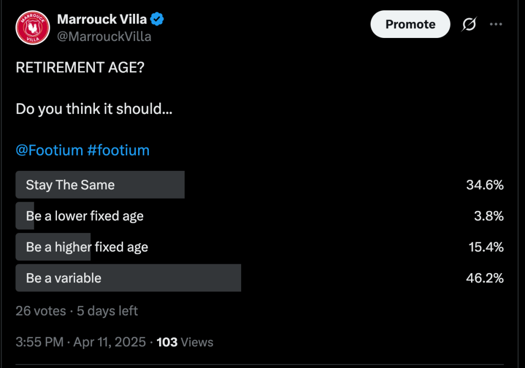 I would like to point out that when I started tweeting about this, I hadn’t actually looked at how MFL do retirement, but one of my proposals is broadly similar to their system. There are some disadvantages which I’ll look at.
